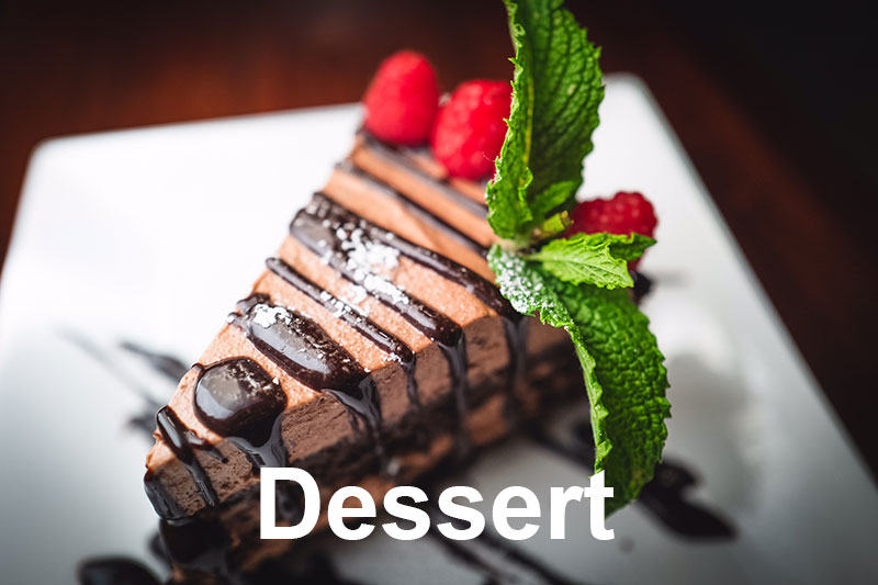 Green Tea Tiramisu Made in house with plum wine. Decadent Chocolate Cake – GF Made in house and topped with fresh berries and drizzled with chocolate sauce.